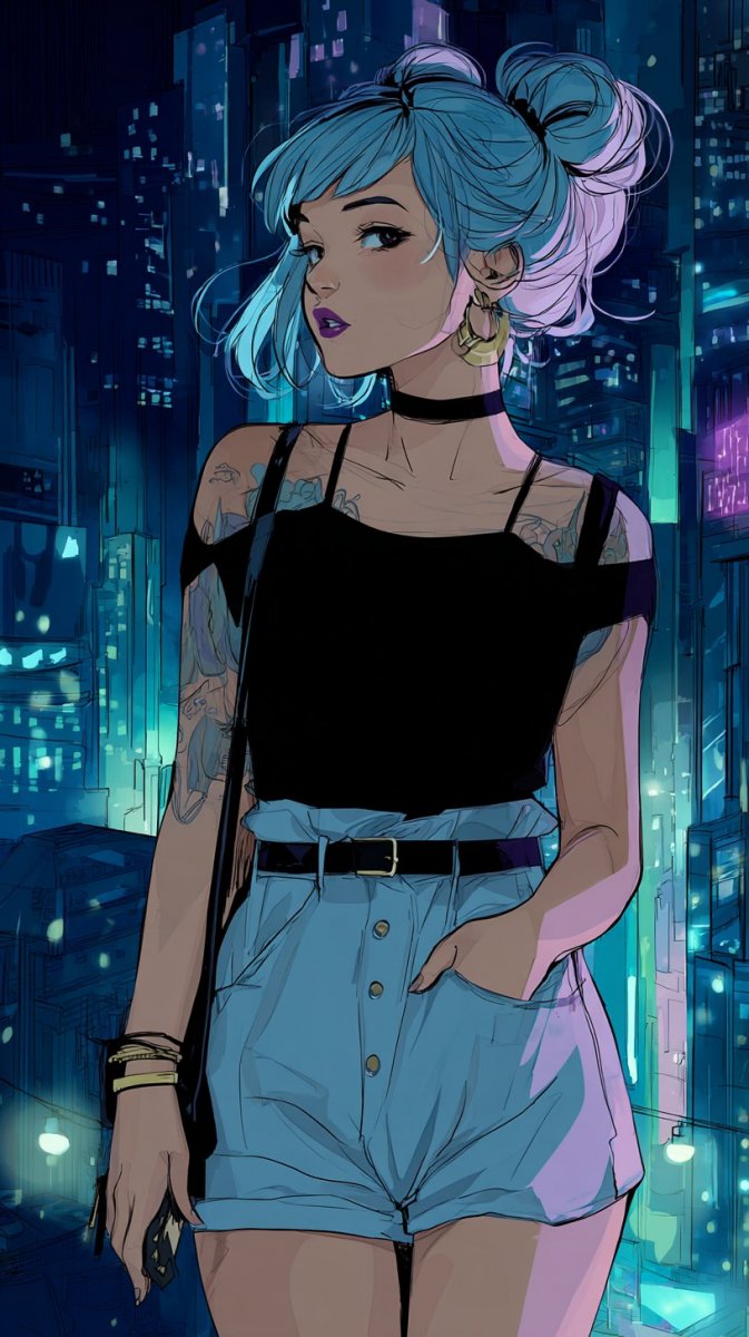 Яркая и дерзкая девушка с неоновыми татуировками уверенно позирует на фоне ночного мегаполиса. В этом захватывающем изображении сочетаются элементы современной моды, уличного искусства и футуристической эстетики. Главная героиня, воплощение беззаботности и стиля, излучает неподдельную харизму своей игривой улыбкой и уверенным взглядом. Ее образ дополнен стильным современным нарядом с яркими акцентами, а кожа украшена замысловатыми татуировками, которые оживают под светом неоновых огней. За ее спиной простирается панорама города: величественные небоскребы устремляются ввысь, а размытые полосы фар машин создают ощущение динамики и движения. Кажется, будто она – неотъемлемая часть этого шумного и сверкающего мира, символ свободы самовыражения и смелости быть собой. Иллюстрация передает атмосферу ночной жизни большого города, где яркие краски переплетаются с энергией и ритмом урбанистического пространства. Это визуальный гимн современному стилю и индивидуальности, воплощенный в образе уверенной и привлекательной девушки. Картина словно дышит жизнью, маня зрителя окунуться в мир неоновых огней и безграничных возможностей