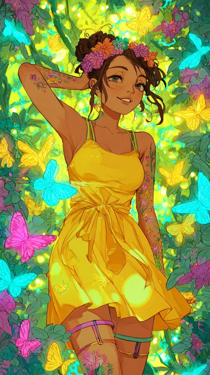 Очаровательная девушка в ярком летнем платье и сандалиях радостно резвится в сказочном саду, полном пестрых цветов и порхающих бабочек. Её тело украшают светящиеся татуировки, излучающие позитив и энергию. В волосах девушки красуется цветочный венок, добавляющий образу нежности и беззаботности. Мягкий золотистый солнечный свет пробивается сквозь листву деревьев, окутывая всю сцену волшебным сиянием и создавая атмосферу сказочного мира. Иллюстрация выполнена в технике чернильного рисунка с акцентом на яркие цвета и детализированную проработку каждого элемента. Это произведение искусства излучает радость, оптимизм и красоту природы, приглашая зрителя окунуться в мир фантазии и безграничной летней сказки. Невероятно позитивное настроение передается через широкую улыбку девушки и ее игривые движения в окружении благоухающих растений. Картина наполнена гармонией и легкостью, словно запечатленный момент счастливого дня. Яркие краски создают визуальный праздник для глаз, а детализированный рисунок позволяет рассмотреть все нюансы этого волшебного сада. Это прекрасное дополнение к любому интерьеру или коллекцию изобразительного искусства