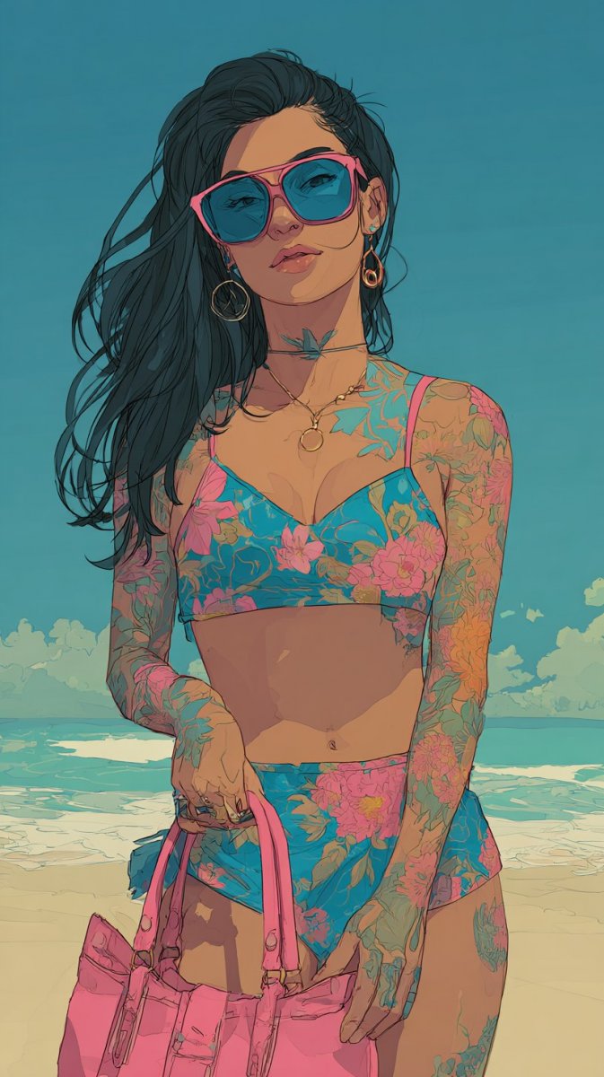 2. Illustration, ink drawing, a bimbette girl stands confidently in a striking pose, flaunting her bright neon tattoos that sparkle against her sun-kissed skin. Dressed in a colorful two-piece bikini adorned with funky patterns, she wears oversized sunglasses and holds a cute pastel handbag. The beach setting behind her features crystal blue waves and golden sand, enhancing her summer vibe. #sp_spintax