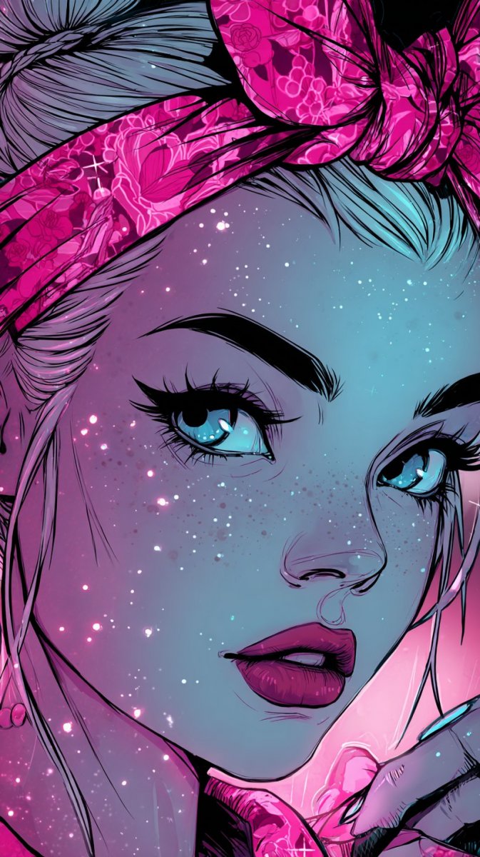 1. Illustration, ink drawing, a stylish ditz bimbo girl with bright radium tattoos poses confidently against a backdrop of swirling galaxies. She wears a playful, oversized pink bow and has exaggerated lashes emphasizing her wide, innocent eyes. The radium tattoos glow with an ethereal light, highlighting intricate floral patterns that weave across her skin. Her lips are painted in a glossy cherry red, adding to the whimsical charm. #sp_spintax