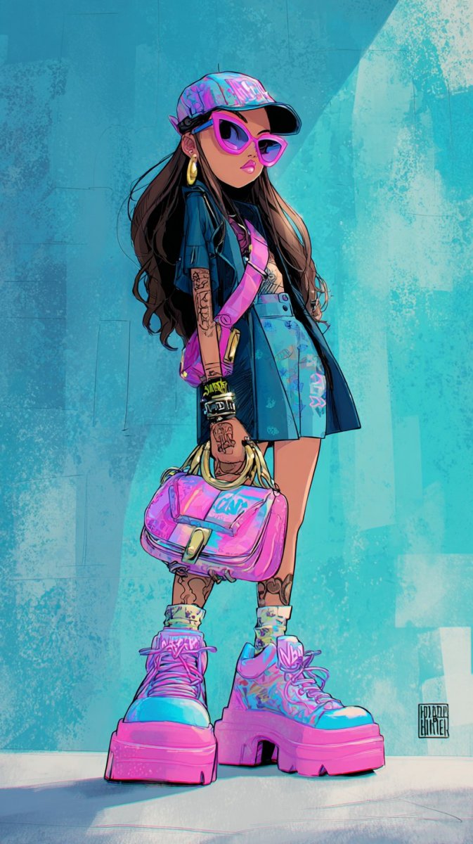 Яркая иллюстрация в технике туши изображает куклу Bratz с вызывающими неоновыми татуировками, излучающую уверенность на фоне динамичного городского пейзажа. Огромные солнцезащитные очки скрывают часть лица, а в руках она держит мерцающую сумочку, добавляя образу блеска и роскоши. Неоновые рисунки покрывают большую часть тела, представляя собой стилизованные элементы уличного искусства в электрических оттенках синего и ярко-розового. Платформенные кроссовки завершают образ, подчеркивая игривый и дерзкий характер куклы. Вся композиция пронизана атмосферой смелости и самовыражения, демонстрируя яркую индивидуальность героини. Иллюстрация выполнена с вниманием к деталям, что позволяет рассмотреть каждый элемент одежды и аксессуаров. Цветовая гамма насыщенная и контрастная, создающая визуальный эффект привлекательности и динамичности. Городской фон служит идеальным фоном для этой дерзкой и стильной куклы Bratz, подчеркивая ее статус иконы моды. Картина передает дух молодости, энергии и безграничной креативности, отражая современный городской стиль жизни. Это произведение искусства станет отличным украшением для любого пространства, добавляя в него нотку бунтарства и оригинальности