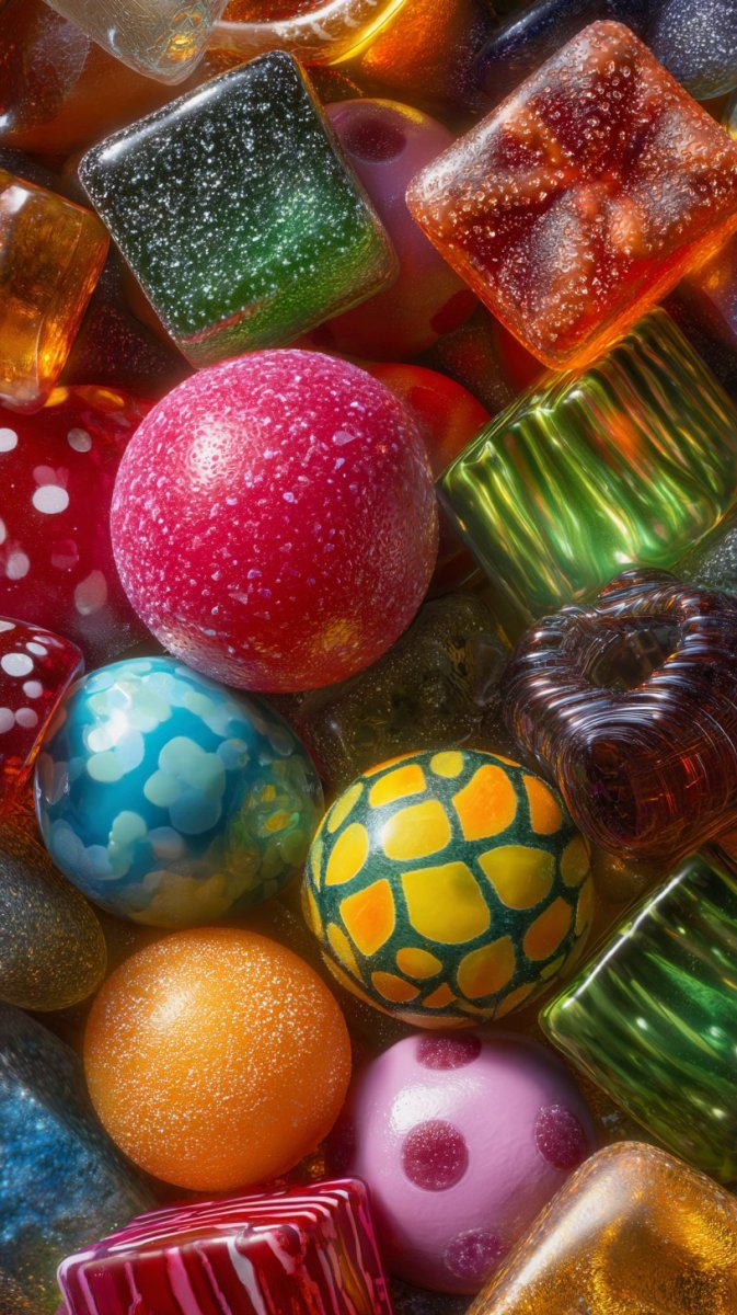 close-up of colorful gummy candies, including candies and sweets in various shapes, textures, and colors, a bg filled with delicious-looking hard candy is also visible, the overall atmosphere creates an attractive visual appeal for sweet tooth enthusiasts, hdr, octane render, 8k resolution #role_food