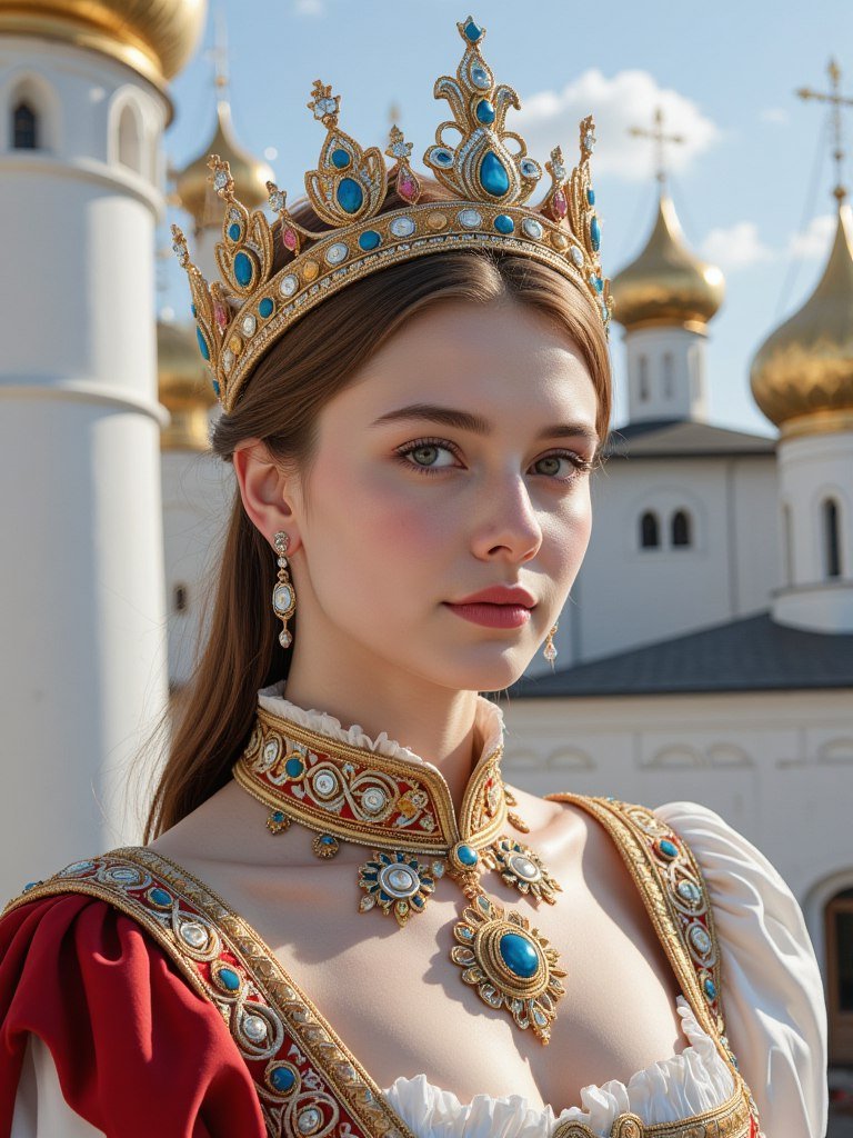 Портрет молодой женщины, воплощающей собой величие и культурное наследие. Её светлая кожа, небесно-голубые глаза и ярко-красные губы создают запоминающийся образ, подчеркнутый царственным спокойствием и легкой самодовольной улыбкой. Возраст девушки около двадцати лет, но её осанка выдает благородство и уверенность. Она облачена в роскошный традиционный наряд, свидетельствующий о богатой истории и глубоких культурных корнях. Высокий воротник, богато украшенный золотой вышивкой, красной тканью и синими драгоценными камнями, переносит нас в эпоху дворцовых интриг и пышных церемоний. На её голове сверкает изящная корона, гармонично сочетающаяся с общим дизайном костюма, а из ушей свисают серьги, повторяющие мотивы украшения головы. Фон изображения – это ряд белоснежных зданий с золотыми луковичными куполами, напоминающими о церкви или историческом дворце, что явно указывает на архитектурное влияние Восточной Европы. Использование малой глубины резкости акцентирует внимание на лице и одежде девушки, а мягкое освещение подчеркивает фактуру материалов, создавая ощущение объема и реалистичности. Вся композиция пронизана духом истории, царской власти и культурного богатства, выполненная в манерe живописи, что придает ей особую художественную ценность и загадочность. Картина словно переносит нас во времена былой славы и величия, где красота и достоинство правят миром