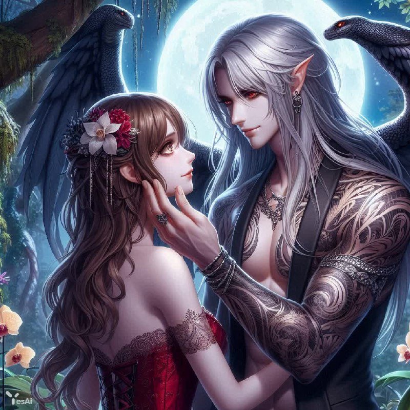 В сердце мистического леса, залитого серебряным светом полной луны, разворачивается сцена таинственной близости. Два силуэта выделяются на фоне экзотической природы: могучий герой и прекрасная героиня. Он – воплощение потусторонней силы, с длинными серебристыми волосами, пронзительными змеиными глазами и огромными черными крыльями, словно сотканными из ночи. Его бледная кожа украшена замысловатыми черными татуировками, подчеркивающими мощь его мускулистого тела. Выражение лица героя спокойно и нежно, он легонько прикасается к щеке своей спутницы, словно передавая ей частицу своей магии. Она – воплощение хрупкой красоты, облаченная в пышное красное платье, которое контрастирует с темной атмосферой леса. Ее длинные каштановые волосы обрамляют лицо с фарфоровой кожей, а взгляд полон задумчивости и легкого волнения, направленный на загадочного героя. За ними простирается тропический лес, полный ярких красок – экзотические орхидеи распускаются среди густой зелени, а за горизонтом пылает ослепительный закат, окрашивая небо в оттенки багрянца и золота. Эта сцена – квинтэссенция мистики и романтики, где встречаются силы природы и человеческие чувства, создавая неповторимую атмосферу загадки и предвкушения. В этом волшебном месте происходит нечто большее, чем просто встреча двух людей - зарождается история, полная опасностей и невероятных открытий