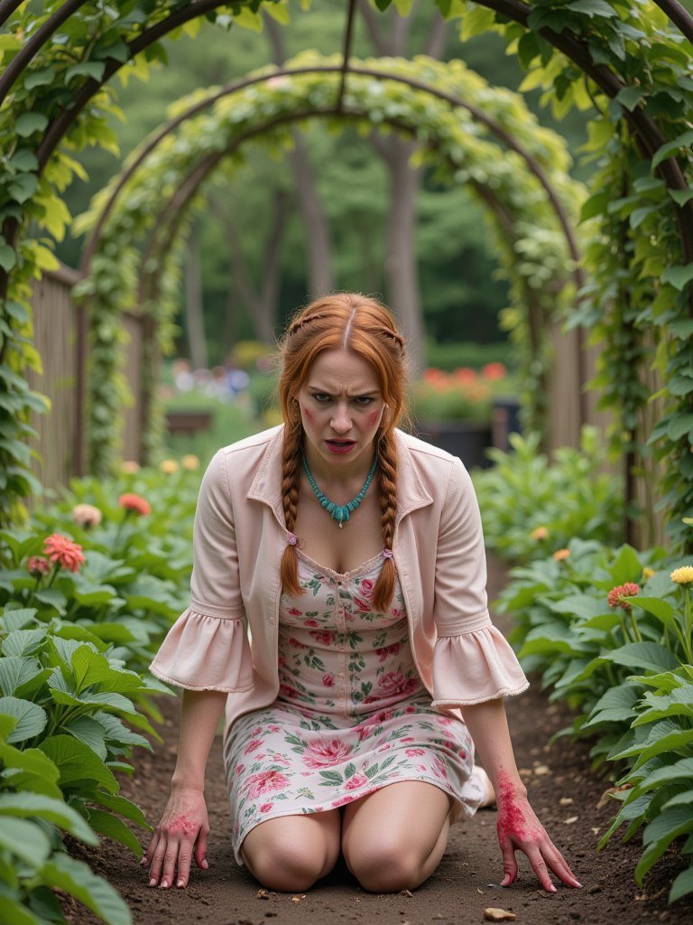 A middle-aged woman, fair-skinned, with an expression of intense frustration and determination, kneels in a garden. She has red-stained hands, wearing a flowered dress, a pale pink jacket with bell sleeves. Her auburn hair is braided and adorned with a pink ribbon. She wears a turquoise necklace. Her furrowed brow and narrowed eyes express anger. She appears to be bare-footed. The garden path she treads is lined with lush green foliage, forming a tunnel-like arch overhead. The background displays other rows of plants and trees, under a soft, diffused daylight. The scene conveys a feeling of earthy realism. The color palette is dominated by sh...