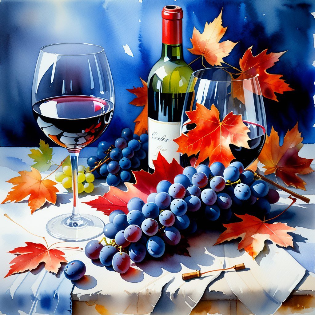 Осенний натюрморт с вином и виноградом в технике английской акварели - Пример изображения, созданного ИИ Stable Diffusion