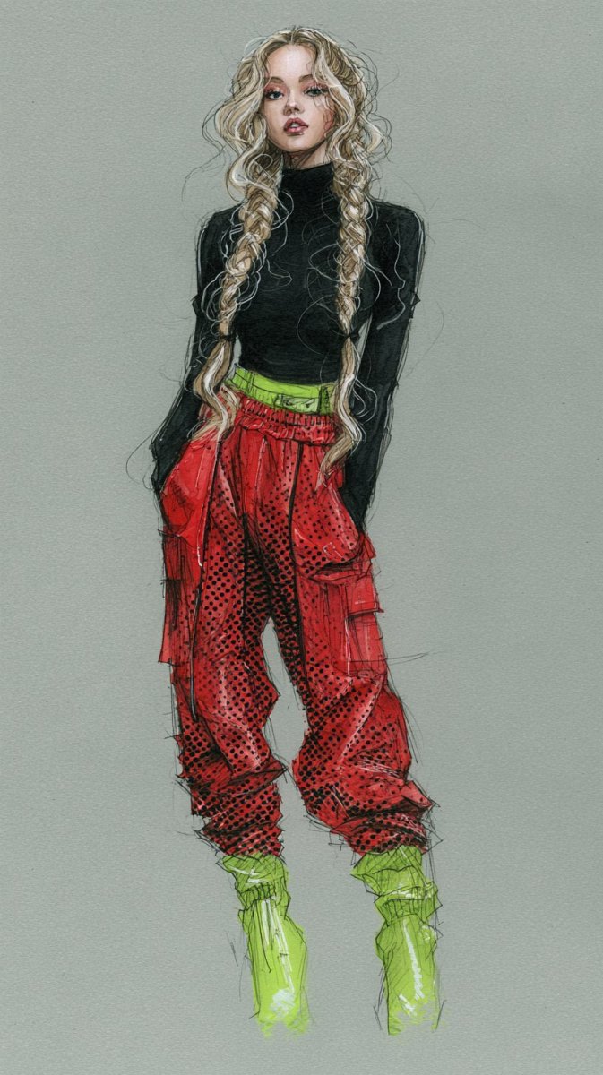 watercolor illustration, ink drawing, fashion model, neon green and black outfit, high collar, black bikini top, red cargo pants with white polka dots, two braids, shiny material, long blonde hair styled in loose waves, bg is grey #role_fashion_model