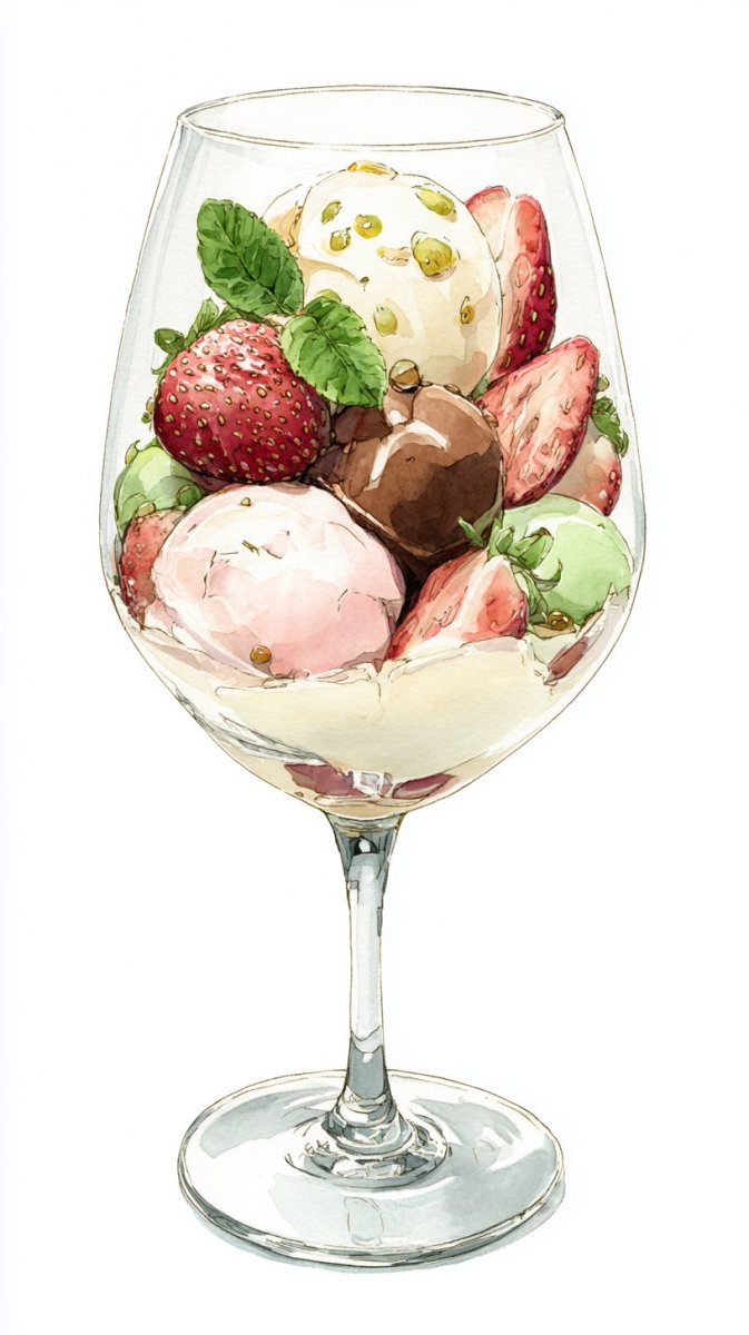 Нежный десерт в стеклянной миске: акварельная иллюстрация - Пример изображения, созданного ИИ Midjourney