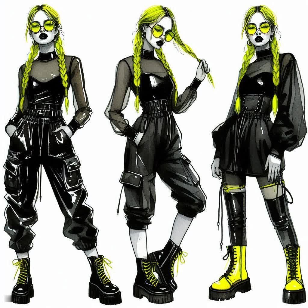 watercolor illustration, ink drawing, fashion model, high neckline black bikini top, shiny material yellow sunglasses, cut-out design chunky sole, long sheer sleeves drawstring waistband, edgy look with neon canary yellow hair styled in two braids, reflective pants black combat boots, high ponytail, overall style modern and edgy #role_fashion_model