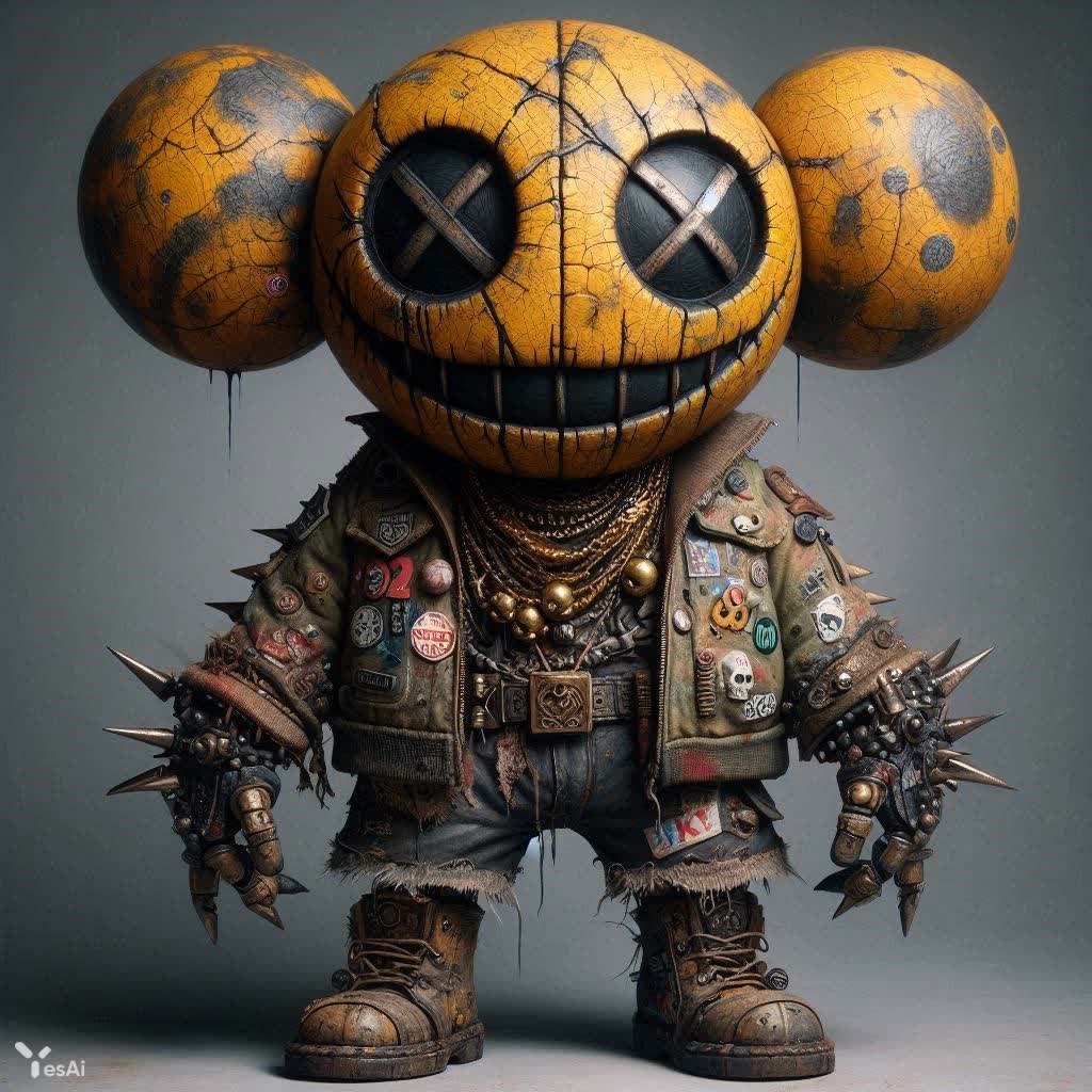 Detailed oil painting, darkfantasy with a slight hyperrealist accent, ArtStation quality, 4K. Fullbody portrait of an original toylike humanoid: oversized weathered yellow spherical head with cracked paint, bold Xshaped black eyes and a wide stitched grin, two balloonlike ear spheres plastered with stickers and small metal spikes. Worn graffiticovered jacket and rugged shorts with frayed seams, chunky skulldecorated boots, layered gold chains mixed with rusted metal spikes, chipped paint, tactile scratches and grime. Emphasize rich impasto brushwork, hyperreal fabric and metal textures, finely rendered paint chips and tactile canvas grain, de...