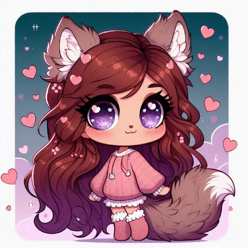 cartoon illustration, chibi style, big eyes, long brown hair, pastel purple background, white lace border, hearts all over, fluffy fur, full-body portrait, whimsical, simple lines, soft lighting, detailed inked lines, playful expressions, fluffy ears, a cute outfit, in the style of lilia alvarado, bright colors, hand-drawn illustration, flat painting, dark teal sky #role_cute_girl