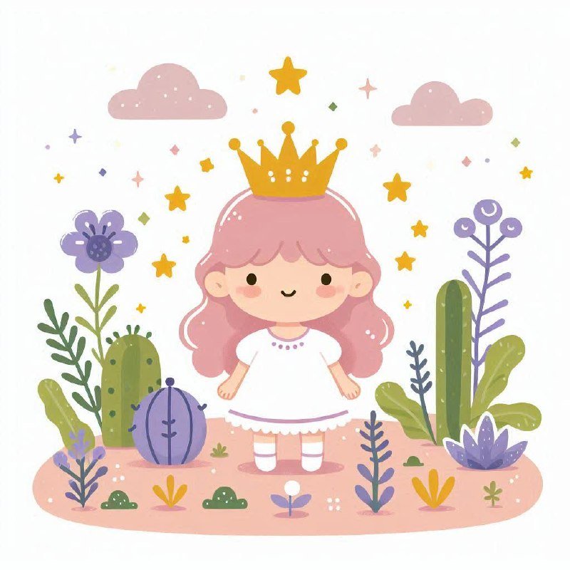 cute little princess wearing crown standing on the ground surrounded by stars, plants, childrens picture book illustrations, simple design, flat color blocks, colorful, high-definition #role_cute_girl