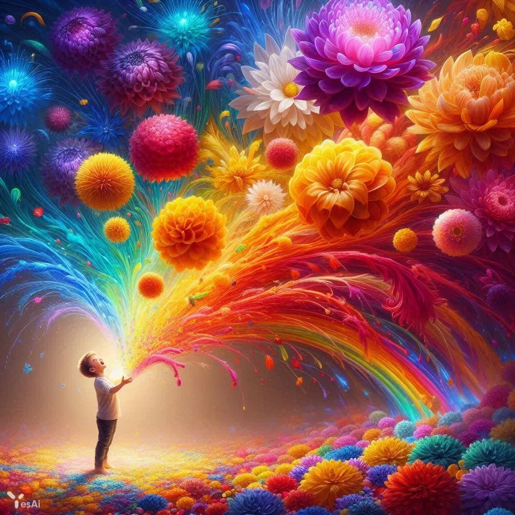 Изысканная цифровая картина, наполненная великолепием и нежностью, воспевает материнскую любовь и радость праздника. В центре композиции – очаровательный мальчик, излучающий безграничное счастье и привязанность, словно утопающий в волшебном океане фантастических цветов. Это не просто букет, а настоящий каскад огромных, сюрреалистичных соцветий, переливающихся всеми цветами радуги: глубокий пурпур, электрический синий, огненно-оранжевый, солнечный желтый, мягкий розовый, мерцающий золотой и яркий зеленый. Цветы словно живой водопад ниспадают вокруг мальчика, создавая ощущение полного погружения в красоту и гармонию. Его лицо освещено искренней радостью и обожанием, взгляд устремлен вверх, к материнской фигуре. Мать стоит позади сына, на небольшом расстоянии, окутанная мягким золотистым сиянием. Она нежно смотрит на своего ребенка, в ее глазах отражается глубокая любовь и удовлетворение, а на губах играет легкая улыбка. Вокруг нее – изящный букет более скромных цветов, гармонично дополняющий пышную цветочную феерию вокруг сына. Фон картины намеренно размыт, создавая ощущение тепла и уюта, словно действие происходит в цветущем саду или на зеленой лужайке, залитой солнечным светом. Вся картина пронизана атмосферой безграничной любви, радости и праздника, а тонкие переходы цветов придают ей сказочную глубину и объем. Вдохновение для создания этого шедевра было черпано из работ Альфонса Мухи и Джорджии О’Киф, но в то же время картина отражает современное видение красоты и наполненна энергией. Особое внимание уделено яркости красок, тщательной детализации и воздушности композиции, создавая ощущение легкости и нежности. Это произведение искусства – истинное воплощение материнской любви и безграничной радости