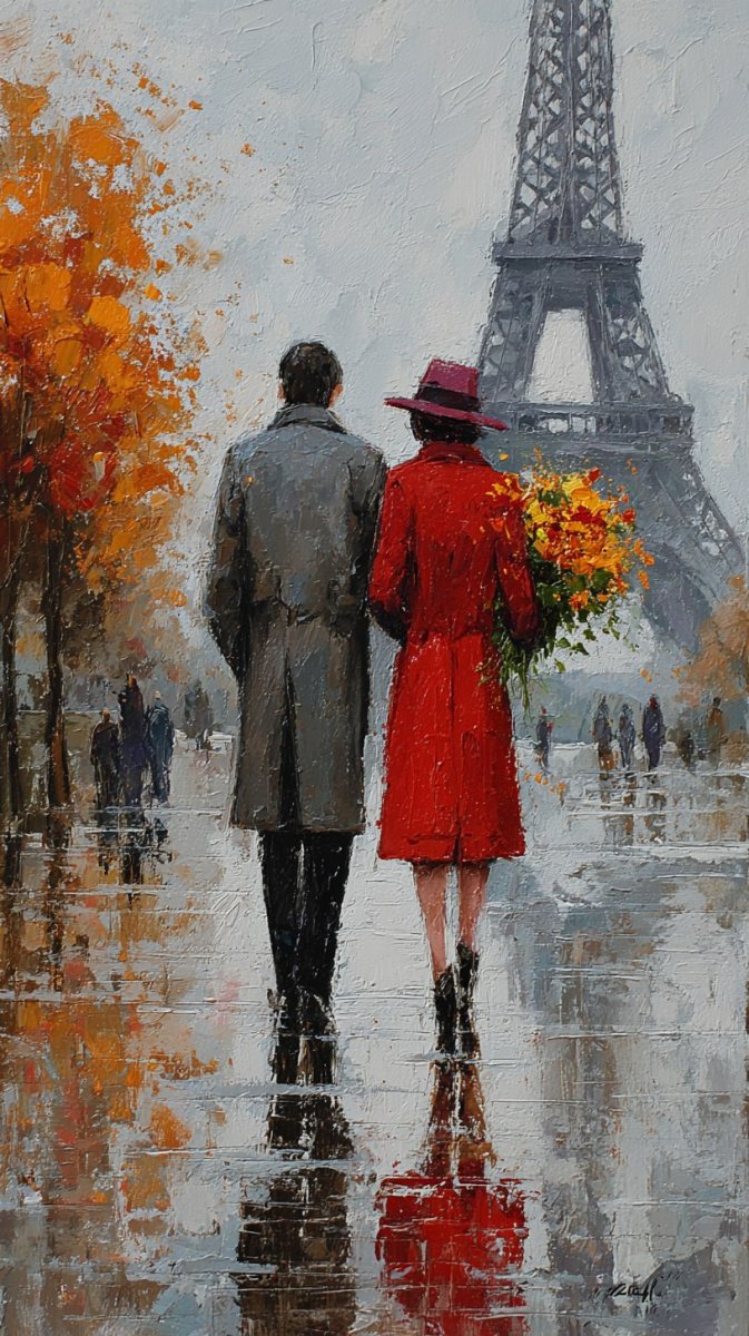 Нежная романтика осеннего Парижа запечатлена в этом кадре. Под черным зонтом, укрывшись от легкого дождя, прогуливаются влюбленные, согревая друг друга теплом объятий. Яркий красный цвет женского пальто и изысканная шляпка контрастируют с серым оттенком мужского плаща, создавая визуально привлекательный образ. В руках женщины – букет осенних листьев, словно символ красоты увядающей природы. Вокруг царит атмосфера умиротворения: разноцветные деревья в золотых и оранжевых тонах отражаются в мокрых лужах, а серое небо лишь добавляет настроения задумчивости и романтики. Этот снимок – воплощение момента искренней близости и тепла, несмотря на прохладную погоду и осенний дождь, создавая неповторимую атмосферу парижской осени, где каждый уголок дышит любовью и красотой природы. Камера запечатлела мимолетное мгновение счастья и нежности, которое хочется сохранить в памяти навсегда, передавая всю прелесть осеннего Парижа и романтического настроения влюбленной пары под зонтом в дождливый день