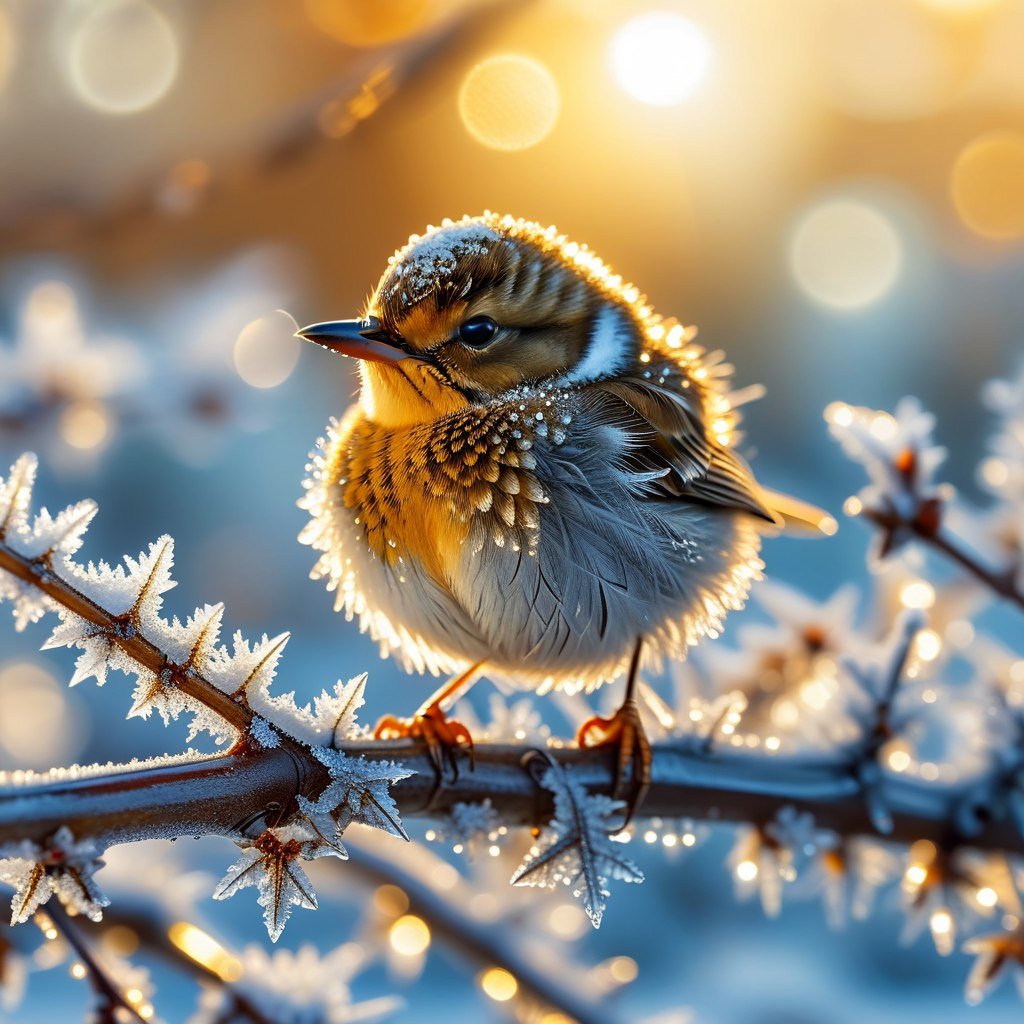 Photorealistic macro of a tiny baby bird on a frost-covered twig, glittering ice crystals, soft golden morning light, shallow depth, cinematic bokeh, delicate magical mood.