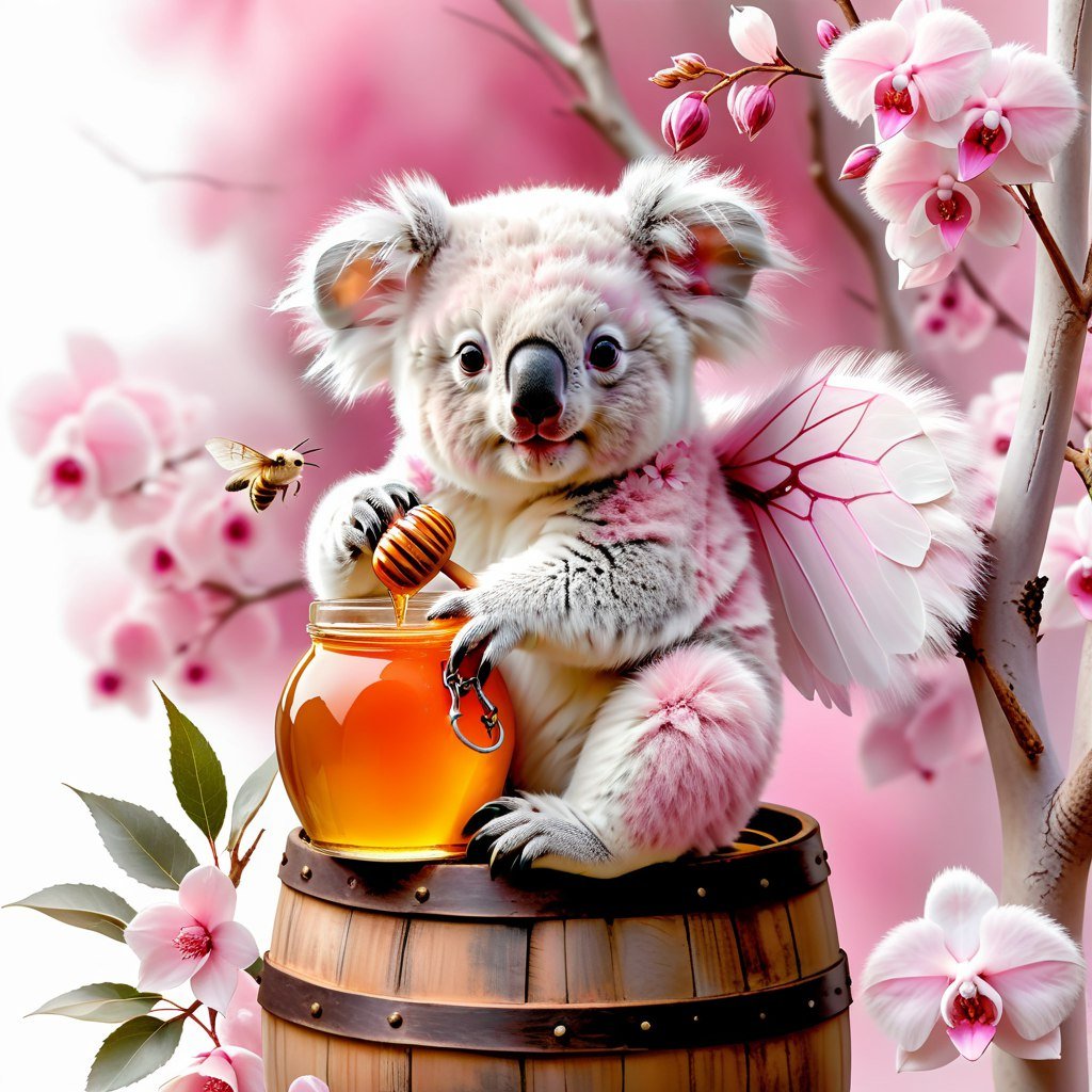 Пушистый розовые белые коала в лапках держит бочонок с медом, бархатистый бело розовый мотылёк.бело розовое дерево,фон бело розовый.