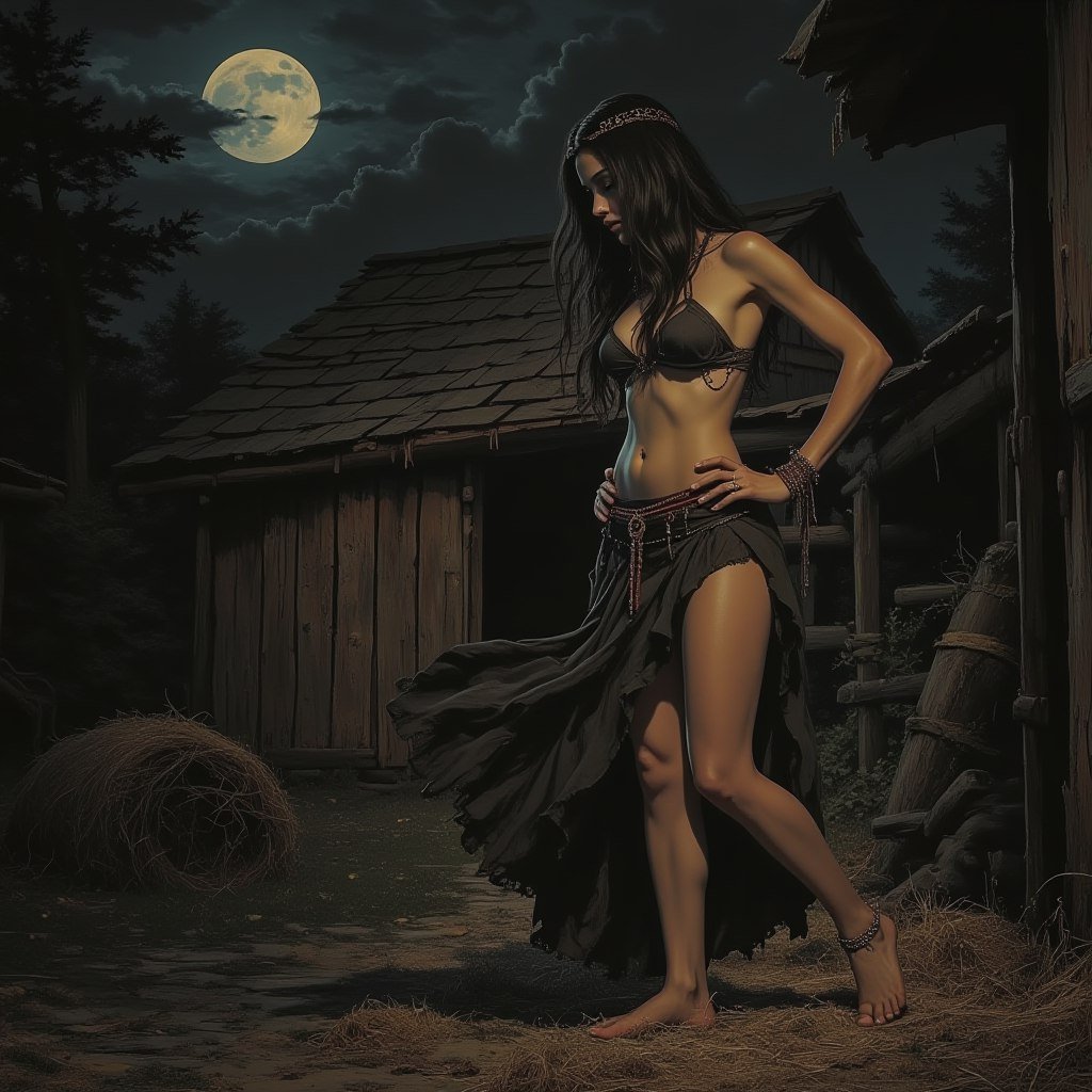 Загадочная ночь любви под лунным светом, где цыганка призывает взорвавшегося страстью путника. Её движения полны грации и чувственности – легкий поворот бедра, уверенный шаг вперед, все пронизано эмоциями. Гипнотический взгляд черных глаз завораживает, а техника сфумато создает эффект невесомости и призрачности. Перед зрителем предстает нежная, но невероятно привлекательная цыганка с длинными струящимися волосами. Края ее пышной юбки игриво вздымаются над коленом, открывая тонкие ноги и намек на изящное белье. Руки украшают многочисленные кольца, бусы и браслеты – свидетельства свободолюбивого духа и таинственной жизни. Действие разворачивается на фоне старого деревянного амбара, сложенного из потемневших досок, вокруг которого раскиданы тюки сена и соломы, создавая атмосферу уединенности и романтики. Вся композиция пронизана чувственностью, загадочностью и очарованием эпохи гиперреализма, где каждая деталь передана с поразительной точностью и реалистичностью. Это история о мимолетной встрече, о запретной страсти и о волшебстве ночи, когда границы между реальностью и мечтой стираются, оставляя лишь ощущение нежности и восторга. В этом визуальном повествовании переплетаются красота, чувственность и тайна, создавая незабываемый образ цыганки, пленяющей сердце одним только взглядом