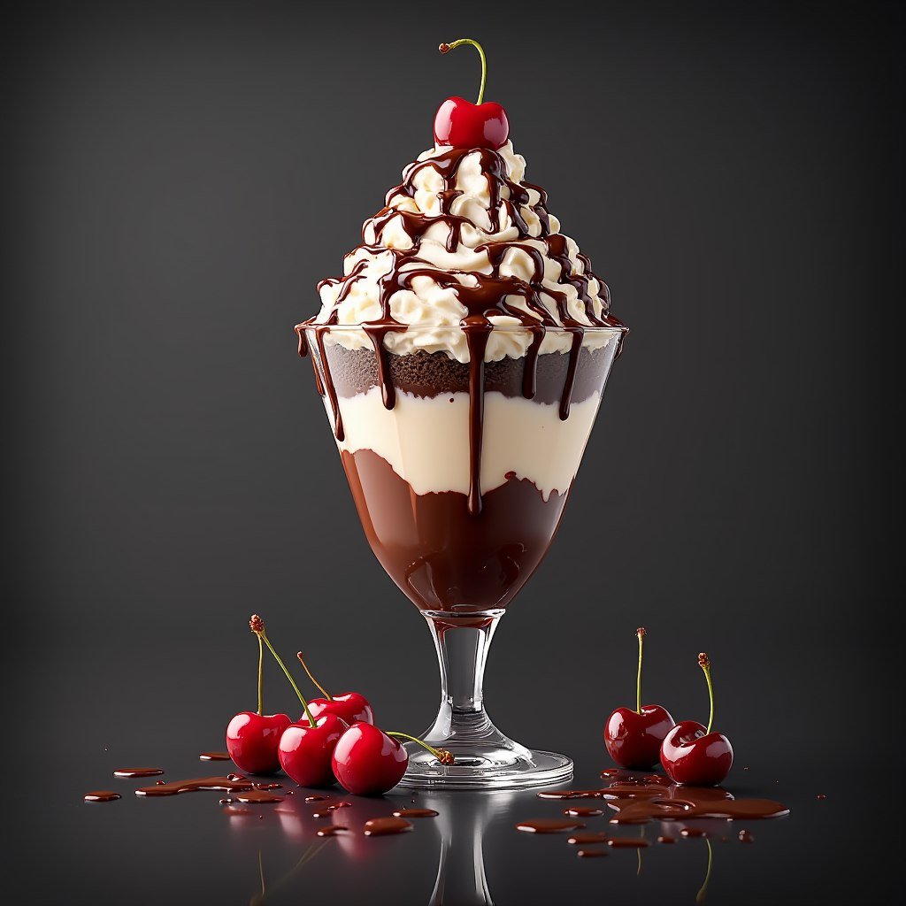 A studio shot showcasing a delectable dessert, a layered sundae in a clear, stemmed glass. The sundae's composition includes layers of vanilla ice cream, chocolate sauce, and chocolate ice cream. Piled high atop the glass is a generous swirl of whipped cream, drizzled with more glossy, dark chocolate sauce that cascades down the sides. A ripe, red cherry with a vibrant green stem is nestled atop the whipped cream. Additional cherries, some with stems, are placed at the base of the glass, resting on a glossy, dark surface upon which melted chocolate sauce has pooled. The background is a smooth, dark gray, offering stark contrast and emphasizin...