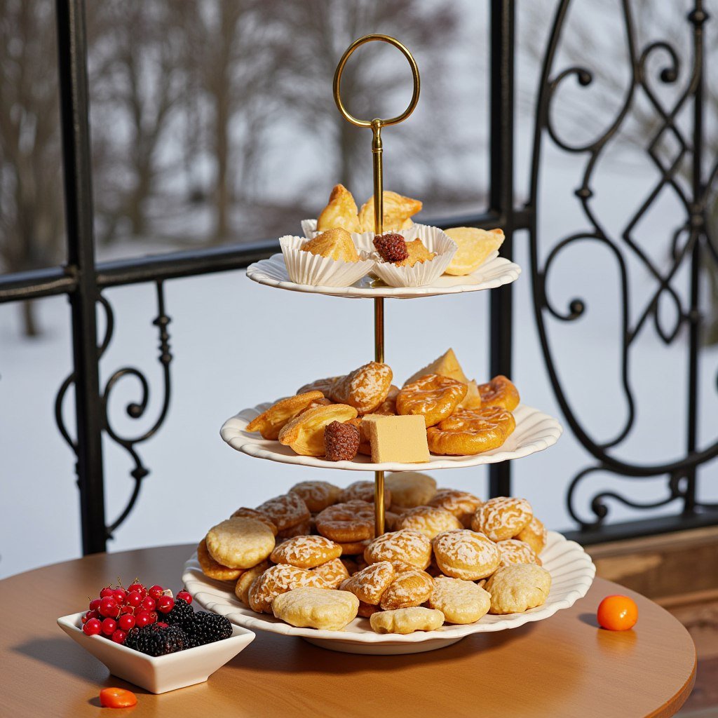 Изысканная композиция в стиле натюрморта, где главным элементом выступает трехъярусная подставка для десертов, словно сошедшая со страниц кулинарной сказки. На белоснежных тарелках с изящной волнистой окантовкой разместилось настоящее пиршество сладостей: на верхнем ярусе – миниатюрные булочки в белых бумажных стаканчиках, дополненные одной единственной сухофруктовой датой насыщенного коричневого цвета. Средний уровень радует глаз полумесяцами нежного желтого теста и прямоугольными блоками, напоминающими пастьюк. Нижний ярус демонстрирует разнообразие форм и узоров – круглые, в виде листьев, изделия легкого коричневого оттенка с замысловатыми рисунками, добавляющими текстуру. В левом нижнем углу красуется небольшая белая чаша, наполненная ярким миксом из красной смородины, черники и двух оранжевых кумкватов – словно вспышка летнего солнца в зимнем пейзаже. Подставка элегантно покоится на деревянном столе, а за окном, обрамленным резными черными рамами, виднеется размытая картина заснеженного сада, создающая ощущение уюта и тепла. Слева слегка проглядывает изящная чашка для чаепития, добавляя сцене нотку ретро-шарма. Мягкий, естественный свет деликатно подчеркивает насыщенные цвета и богатую текстуру сладостей, наполняя атмосферу неповторимым очарованием и приглашая насладиться моментом блаженства. Это настоящее произведение искусства в жанре food photography, запечатлевшее красоту и великолепие кулинарного мастерства