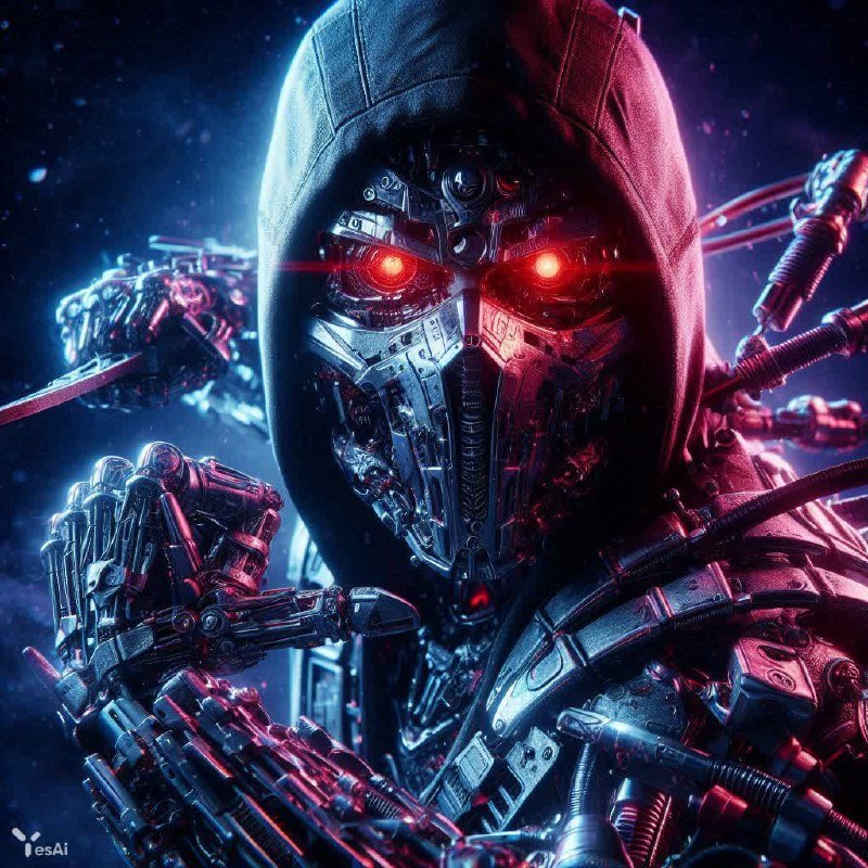Mortal Kombat, cybernetic theme, lots of details, mechanisms, half-metal, half-human, half-mask, red eyes, fighting stance, dark night background, ultraviolet haze, dark palette, dark art, Frank Frazetta style