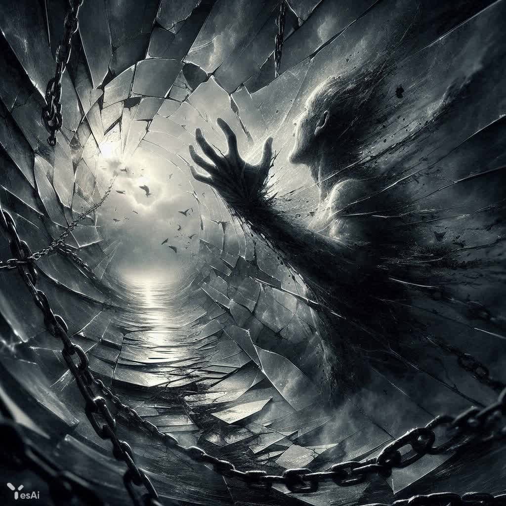 Отражение боли: пленённый в петле отчаяния и забытых воспоминаний. Изображение из нейросети Далли 3