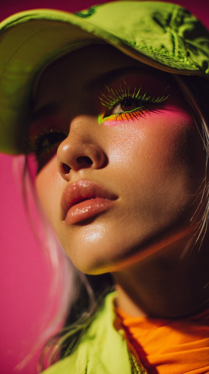 editorial photo of the most beautiful model in fluorescent neon green pink and orange, luminous ink drawing illustration, striking makeup, playful haute-couture poses, vibrant baseball cap adorned with patterns, studio lighting bold eyeliner #role_neon_model