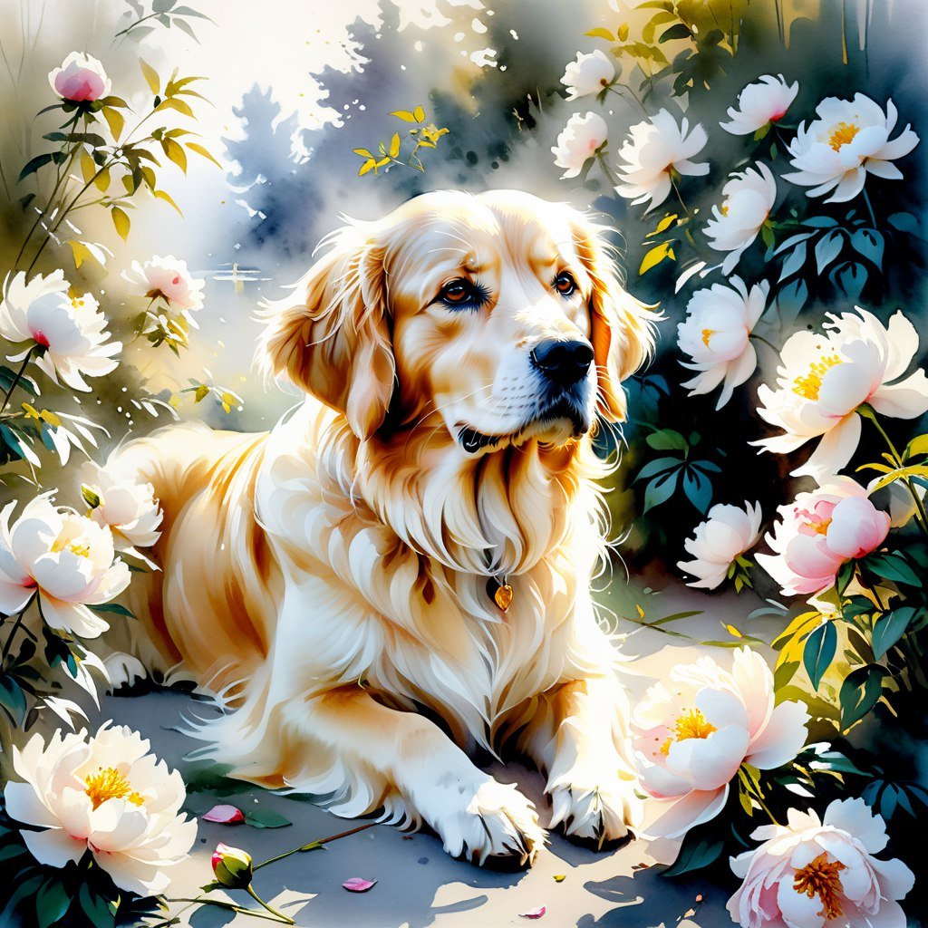 Нежная акварельная зарисовка, пропитанная утренней дымкой и легкой прозрачностью. Изображение выполнено в технике сфумато, создавая ощущение воздушности и невесомости – словно мираж или воспоминание о летнем дне. Мягкий рассеянный свет едва касается сцены, подчеркивая деликатный переход от света к тени, игру бликов и полутонов приглушенной палитры. В центре композиции – золотистый ретривер, уютно расположившийся под раскидистым кустом нежных пионов. Летнее солнце ласково согревает его шерсть, а вокруг царит атмосфера спокойствия и умиротворения. Картина передаёт тончайшие нюансы света и тени, словно сотканные из тумана и лучей солнца. Это воплощение хрупкой красоты природы, выполненное в духе мастеров акварельной живописи – Лиу И, Ивана Славинского и Харрисона Фишера. В каждом мазке чувствуется мастерство художника, стремящегося запечатлеть мимолетную красоту момента, передать ощущение легкости, воздушности и нежной хрупкости мира. Это настоящее произведение искусства, которое дарит зрителю чувство гармонии и умиротворения, погружая в атмосферу летнего дня, наполненного тишиной и покоем. Изящное сочетание цветов и техник создает неповторимый эффект прозрачности и текучести, словно акварель растворяется в воздухе, оставляя после себя лишь ощущение нежности и света