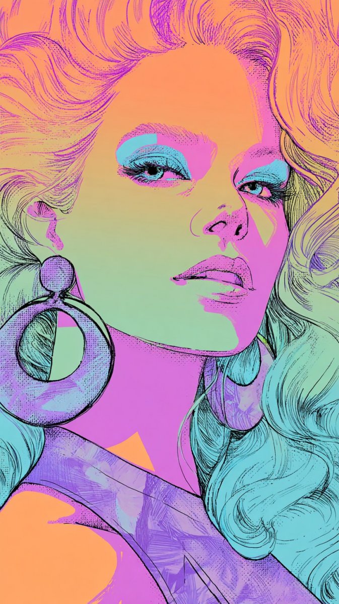 Яркая иллюстрация в технике туши демонстрирует изысканную высокую моду с элементами авангарда и вдохновением от стиля Барби. В центре внимания – модель, облаченная в экстравагантное платье, сочетающее в себе смелые дизайнерские решения и игривость образа куклы Барби. Длинные кудрявые волосы цвета блонд создают объемную прическу, а яркие тропические аксессуары в стиле хиппи добавляют образу экзотики и индивидуальности. Особое внимание привлекают крупные красочные серьги и смелый макияж с неоновыми веками, излучающими свечение. Использование насыщенных цветов и эффектная игра света создают динамичную и запоминающуюся композицию. Этот образ воплощает собой дерзкий дух моды будущего, сочетая в себе классическую элегантность высокой моды и бунтарский характер авангарда с ноткой наивности и беззаботности. Иллюстрация передает атмосферу яркого праздника и подчеркивает креативность и смелость в создании модного образа, представляя собой визуальную оду неоновому сиянию и экстравагантным решениям в мире моды. Этот проект – настоящий манифест свободы самовыражения через одежду и аксессуары, где каждая деталь играет важную роль в создании неповторимого и запоминающегося впечатления. Это визуальный гимн яркости и оригинальности