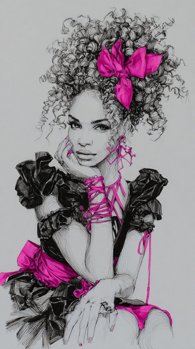 2. ink drawing, illustration, fashion model with eccentric style, big curly hair, wearing fluorescent neon pink dress, vibrant accessories, striking eye makeup, radiant neon. #role_neon_model