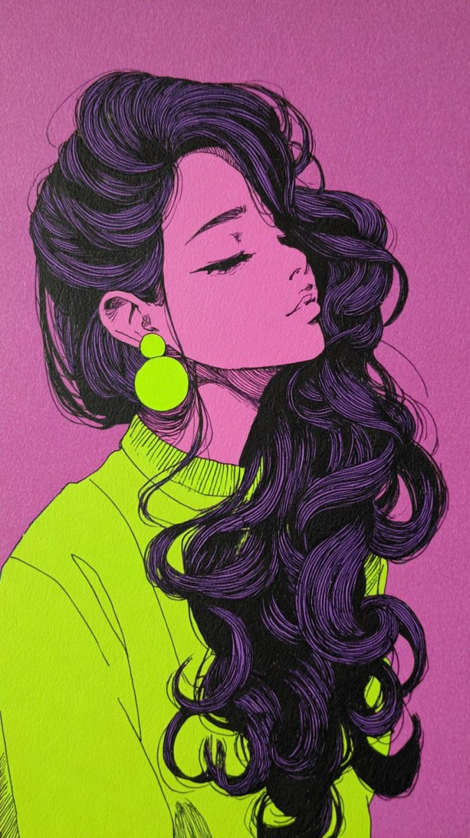 Яркая и динамичная иллюстрация в технике туши, изображающая модель в экстравагантном высоком стиле. Её длинные кудрявые волосы взрываются цветом, а наряд, словно сотканный из мерцающего великолепия, привлекает внимание своей игривостью и блеском. Акцент сделан на эффектных неоновых деталях, которые создают ощущение модной феерии и визуального восторга. Образ дополняют забавные серьги, добавляющие образу легкости и индивидуальности. Эта работа – настоящий гимн современному гламуру и смелому сочетанию цветов, воплощенный в изысканном рисунке, который захватывает дух своей яркостью и энергией. Модель словно сошла с подиума футуристического показа, демонстрируя последние тенденции высокой моды в формате яркого визуального произведения искусства. Это не просто иллюстрация – это взрыв цвета, текстуры и стиля, созданный для самых искушенных ценителей моды и современного дизайна. Яркий образ подчеркивает смелость и креативность художника, а неоновые акценты придают работе особую привлекательность и современность