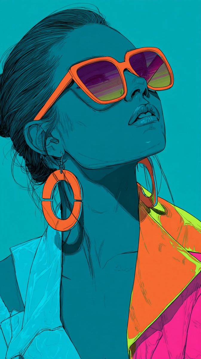 Яркая и эксцентричная мода в неожиданном сочетании – вот что представлено на этом изображении. Изысканная модель демонстрирует смелый haute couture образ, сотканный из дерзких блоков неоновых цветов. Кажется, будто художник заигрался с цветом, создавая визуальный взрыв энергии и позитива. Акцент сделан на детали: крупные эффектные серьги, игривый макияж и стильные солнцезащитные очки в стиле вестерн дополняют этот футуристичный и запоминающийся look. Свет буквально льется на модель, подчеркивая сияние неоновых оттенков и создавая ощущение нереальности происходящего. Эта работа – настоящий манифест смелости и самовыражения в мире моды, где правила создаются, а не следуют им. Она воплощает собой дерзкий дух эпохи, когда яркие цвета и необычные формы становятся символом свободы и индивидуальности. Эта иллюстрация отражает тенденцию к экстравагантности и желанию выделиться из толпы, оставаясь при этом элегантным и стильным. Погрузитесь в мир неоновых оттенков и дерзкого дизайна, где мода становится искусством, а модель – живой картиной. Это визуальное пиршество для глаз, которое заставляет задуматься о границах творчества и возможностях самовыражения через одежду и аксессуары. Безусловно, этот образ вдохновляет на эксперименты с цветом и формой, предлагая новые перспективы в понимании моды как средства коммуникации и искусства