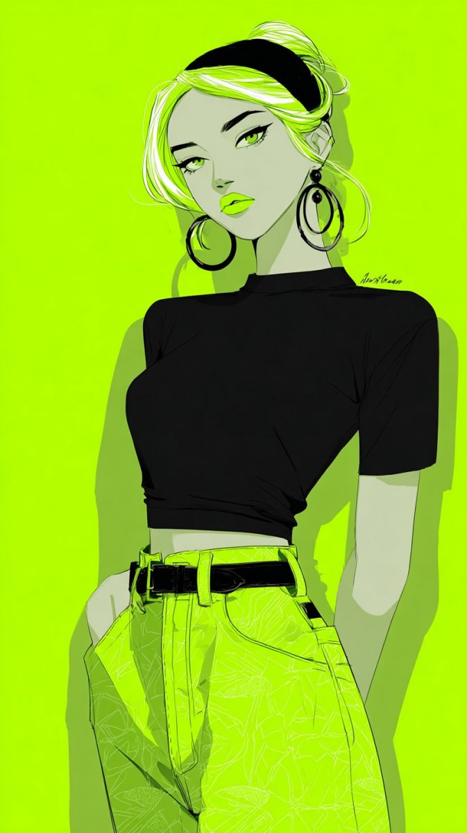 illustration, ink drawing, model wearing neon green earrings, bold neon eye shadow and lipstick, bright patterned shirt with jeans, hair styled in long waves, eccentric barbie style, brillianty neon bright. #role_neon_model