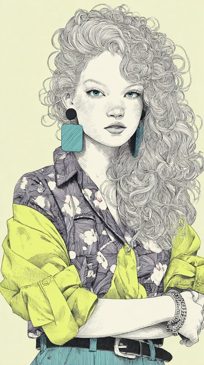 ink drawing, illustration, fashion model eccentric Russian blonde woman with big curly long hair, wearing fluorescent neon outfit with playful makeup look, bright patterned shirt with jeans, accessories include unique earrings, vaporware aesthetic #role_neon_model