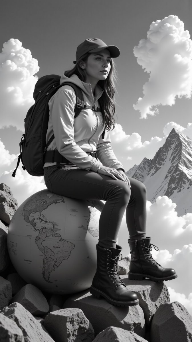 black and white photo of a woman in mountain gear with boots sitting on a globe, a photorealistic painting by Austin Briggs, fantastic realism, portrait of an adventuress, artgerm. high detail, girl in the clouds, Beeple and Jean Giraud, Steve Henderson lost in dreams, Antoine Colignon looking cool