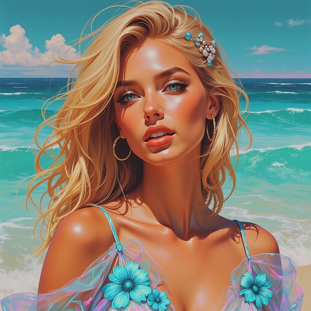 Изысканный портрет, пленяющий своей красотой и загадочностью. В центре внимания – лицо молодой женщины с золотистыми локонами, обрамляющими совершенные черты лица. Легкий загар придает коже сияние, а выразительные темно-бирюзовые глаза словно излучают внутренний свет. Аккуратная заколка, украшенная жемчугом и бисером, добавляет образу элегантности и утонченности. На губах играет смелая улыбка, отражающая уверенность и беззаботность. Она предстает в полупрозрачном голографическом платье небесно-голубых оттенков, украшенном яркими неоновыми цветами, словно ожившими на ткани. За ее спиной простирается бескрайний океан, создавая живописный фон для этой феерической картины. Женщина застыла в динамичной и грациозной позе, демонстрируя гибкость и легкость движений. Вся композиция пронизана богатством красок, а реалистичная детализация позволяет рассмотреть каждую черточку лица, каждый блик на коже и каждый лепесток цветка. Объемность изображения создает ощущение присутствия, словно зритель находится рядом с этой прекрасной женщиной. Использование темных акварельных техник добавляет картине глубины и загадочности, подчеркивая прозрачность и переливы света на ткани платья и в глазах модели. Это произведение искусства – настоящая ода красоте, гармонии и безграничной фантазии художника. Картина захватывает дух своим реализмом и детальной проработкой, создавая ощущение присутствия в волшебном мире, где реальность переплетается с мечтой