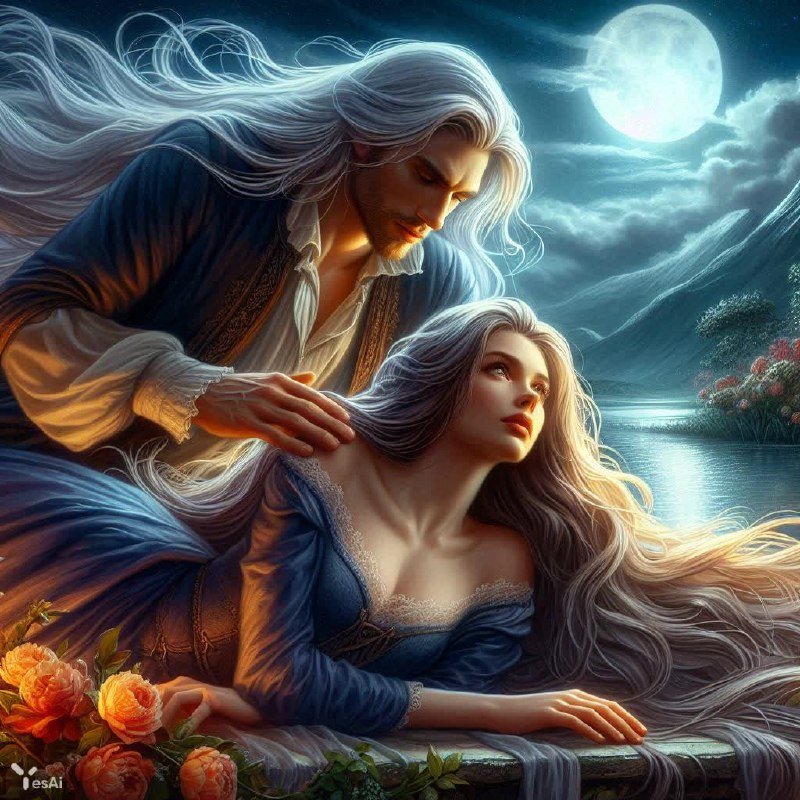 A digital illustration showing a handsome man gently touching the chin of a beautiful woman. who is lying down, and a man is bending over her. The man has long flowing white hair, the woman has brown hair. Night, warm light, a date in the garden. Moonlight casts reflections on the lake. Magic, fantasy, magic.