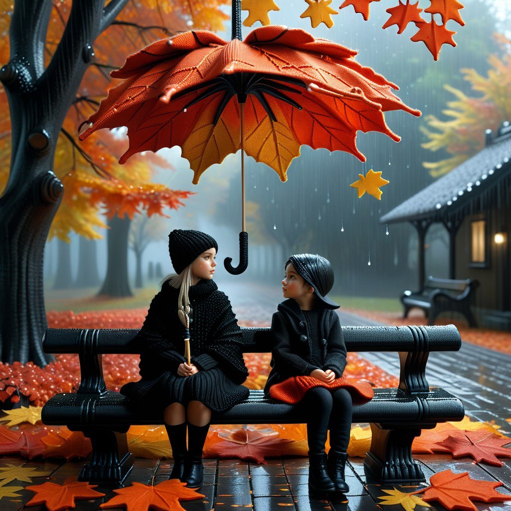 Меланхоличная осенняя сцена в стиле Гигера: одинокий мальчик на скамейке наблюдает за девочкой под зонтом в виде кленового листа, парящей над ним как вязаное облако. Атмосфера пронизана тихой грустью и уютом осеннего дождя. Детализированная композиция передаёт ощущение хрупкости и эфемерности момента, создавая завораживающее визуальное впечатление. Присутствие кленового листа символизирует красоту и мимолетность осени, а вязаные элементы придают сцене сказочную нереальность. Мягкое освещение подчеркивает глубину и текстуру каждого элемента, от капель дождя до сложных узоров на облаке и зонте. Общая эстетика произведения вызывает чувство ностальгии и задумчивости, погружая зрителя в мир фантазий и сновидений. Картина сочетает в себе элементы сюрреализма и реализма, создавая уникальный художественный стиль, вдохновленный работами Ганса Гигера. Это не просто изображение, а целая история, рассказанная без слов, наполненная символизмом и глубоким эмоциональным подтекстом. Вязаные текстуры облака и зонта контрастируют с более реалистичным изображением мальчика и окружающего пейзажа, создавая ощущение волшебства и сказки. Идеально подходит для тех, кто ценит необычные визуальные образы и любит погружаться в мир фантазий