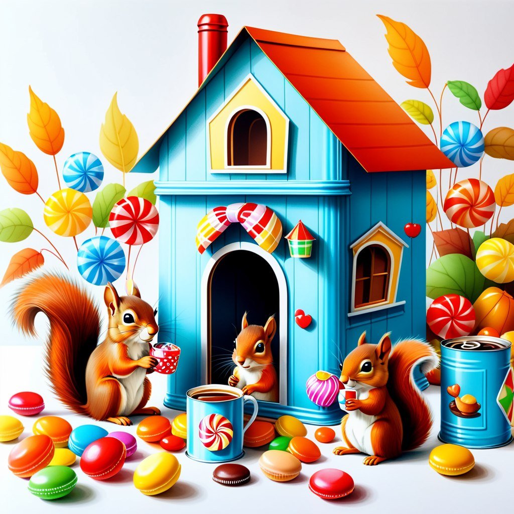Милый домик, поместившийся прямо в пустой кофейный контейнер, оживает на странице детской книги. Внутри этого уютного жилища обитают очаровательные белки, которые с удовольствием устраивают чаепитие, наслаждаясь сладостями – роллами из конфет. Эта трогательная сцена выполнена яркими цветными лазерными карандашами, создавая неповторимую атмосферу сказки и волшебства. Каждая деталь продумана до мелочей, от крошечной посуды для чая до пушистых хвостиков белок, что добавляет картине особый шарм и привлекательность. Иллюстрация излучает тепло и позитив, приглашая юных читателей окунуться в мир фантазий и приключений. Невероятно детализированный рисунок демонстрирует мастерство художника, который умело сочетает нежные цвета и плавные линии, чтобы передать атмосферу домашнего уюта и беззаботного веселья. Этот образ точно станет любимым для детей, вдохновляя их на собственные творческие свершения и даря море радости и позитивных эмоций. Он словно шепчет о важности дружбы, доброты и умении находить счастье в самых простых вещах. Идеальное дополнение к любой детской сказке или просто милая иллюстрация для украшения комнаты ребенка