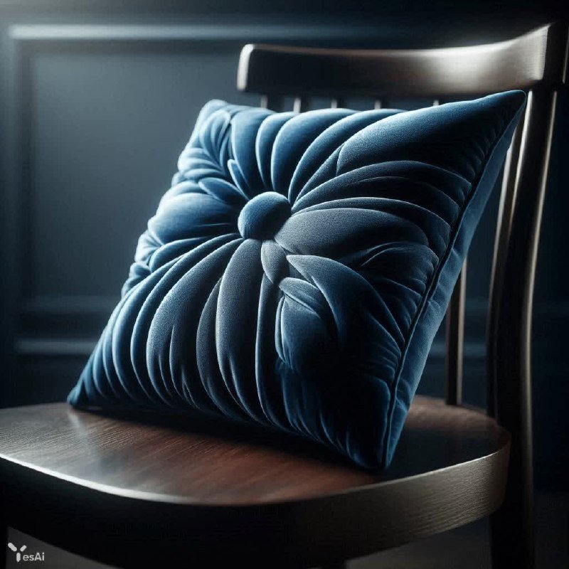 Изысканная подушка из синего бархата на темном стуле - Картинка, созданная ИИ Dalle 3