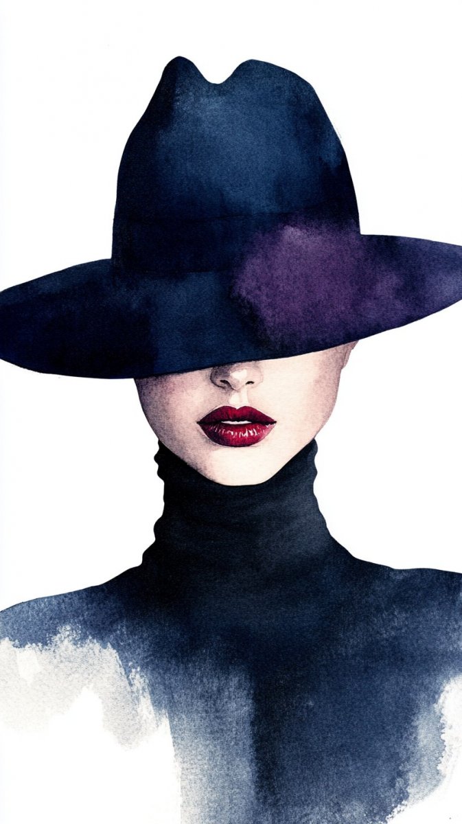 Загадочная элегантность в акварельных мазках – завораживающая иллюстрация моды, где таинственная женщина становится воплощением стиля и недосказанности. Ее взгляд скрыт под широкой темной фетровой шляпой, добавляя образу глубину и интригу. Классический черный водолазка подчеркивает изящный силуэт, а смелые красные губы – яркий акцент в монохромной палитре. Художественный стиль выделяется свободными, растекающимися цветами глубокого индиго, насыщенного мадженты и черного на фоне чистого белого полотна. Каждая капля краски словно рассказывает свою историю, создавая ощущение легкости и воздушности. Это минималистичное произведение искусства – ода современной женственности, сочетающая в себе простоту линий и сложность цветовых переходов. В ней чувствуется утонченность вкуса и стремление к совершенству. Иллюстрация излучает уверенность и загадочность, оставляя пространство для воображения и интерпретаций. Невероятно стильный и лаконичный образ, который захватывает внимание своей сдержанной красотой и вызывает желание разгадать тайну этой женщины. Это не просто иллюстрация моды – это настроение, состояние души, запечатленное в акварельных красках