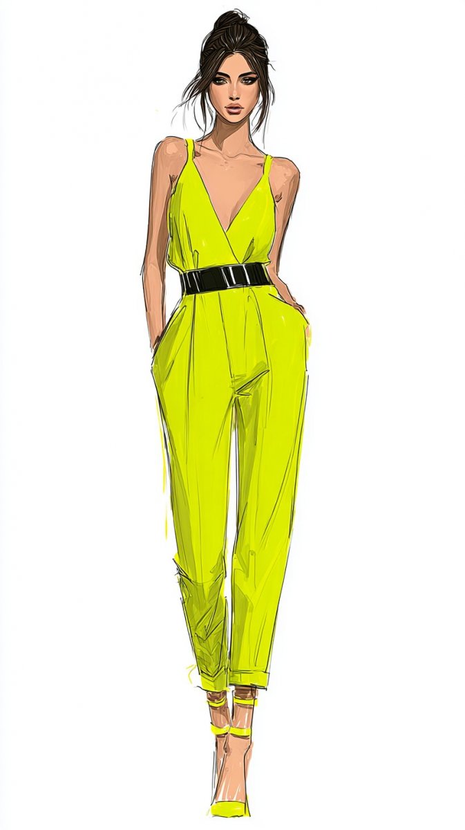 #4 illustration, ink drawing, fashion model, neon colors posing in neon green jumpsuit with deep v-neckline and thin straps crossing over chest, cinched at waist with black belt, high-waisted reflective pants, long brunette hair and black sunglasses, bg is plain white #role_fashion_model