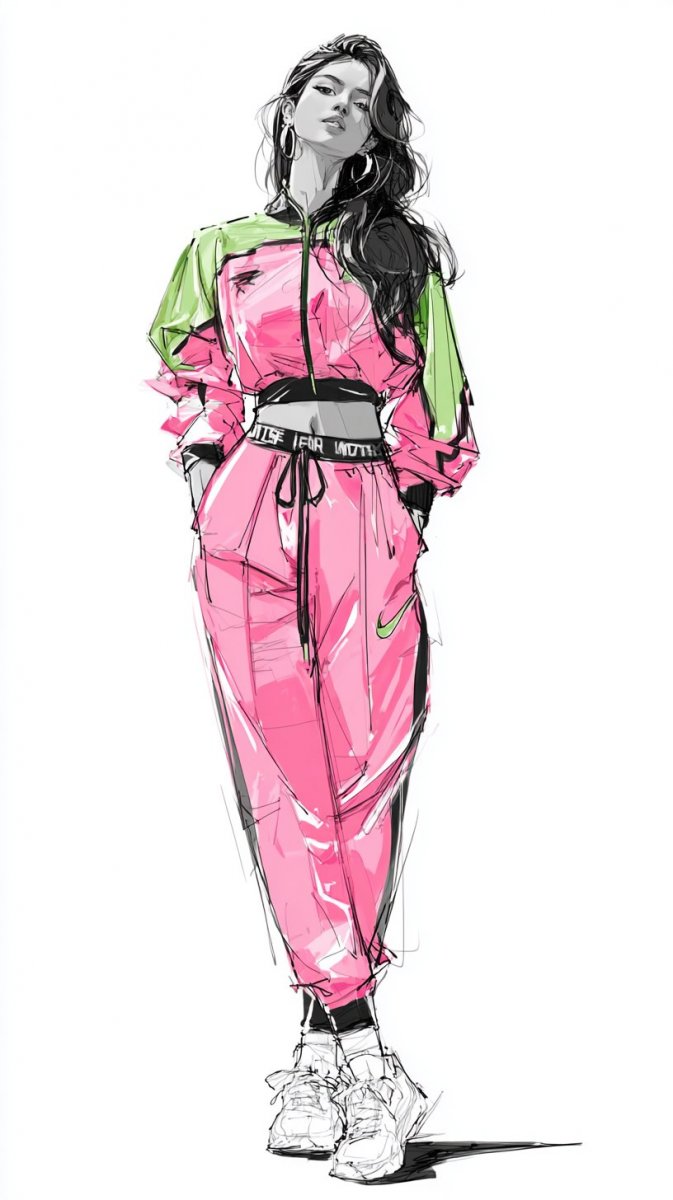 Яркий и динамичный образ современной модной модели, запечатленный в стильной иллюстрации. Рисунок выполнен чернилами с акцентом на насыщенные неоновые цвета, создающие эффектную визуальную композицию. Модель демонстрирует модный спортивный комплект: розовый и черный трексуит с яркими неоново-зелеными полосами, подчеркивающими современный силуэт. Высокий воротник и длинные рукава добавляют элегантности, а утягивающий шнурок на поясе брюк позволяет регулировать посадку. Завершает образ пара белоснежных кроссовок, идеально сочетающихся с общей цветовой гаммой. Длинные темные волосы, уложенные в свободные волны, обрамляют лицо модели, подчеркивая ее уверенный взгляд, направленный прямо в камеру. В целом, иллюстрация создает впечатление модной и дерзкой фотографии, отражающей последние тенденции современной fashion-индустрии. Этот образ воплощает собой сочетание спортивного стиля и высокой моды, демонстрируя актуальность ярких цветов и смелых дизайнерских решений. Иллюстрация излучает энергию и уверенность, что делает ее привлекательной для широкой аудитории, интересующейся модой и современным искусством