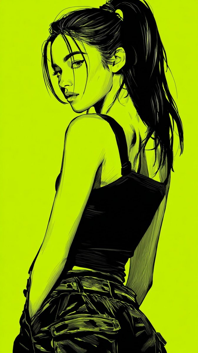 #2. illustration, ink drawing, fashion model, neon colors, featuring a girl in neon green cargo pants and a black tulip-printed tank top, striking a pose with long dark hair styled in a sleek ponytail, bg is bright and cheerful. #role_fashion_model