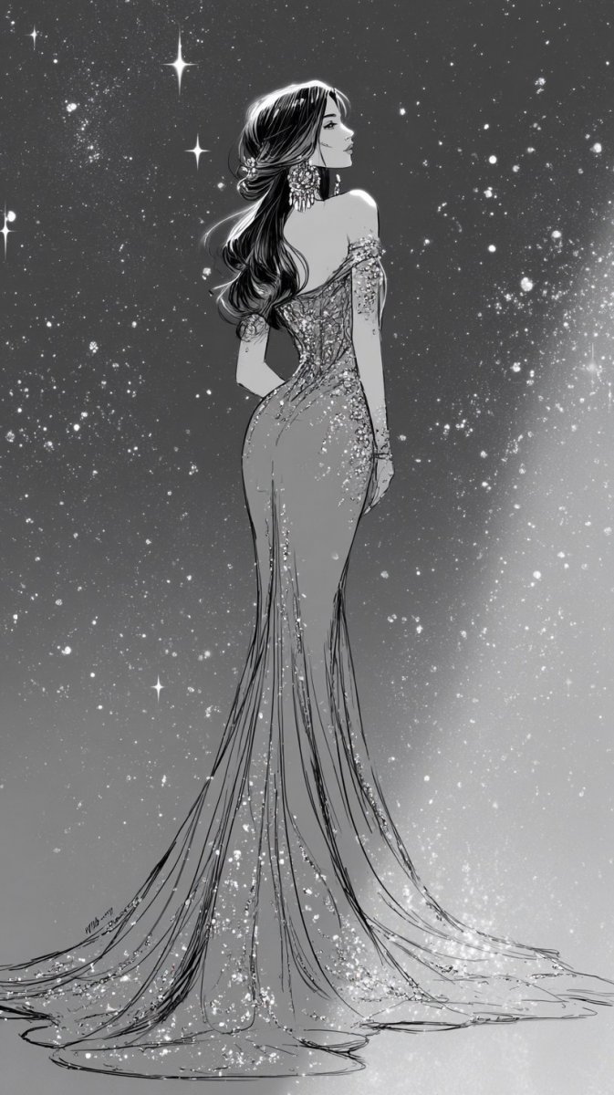 #4. illustration, ink drawing, siren, showcasing a shimmering silver gown with off-shoulder design, high slit, long dark hair cascading down, wearing statement earrings, posing elegantly in front of a sparkling backdrop of stars, enchanting mood, #role_fashion_model