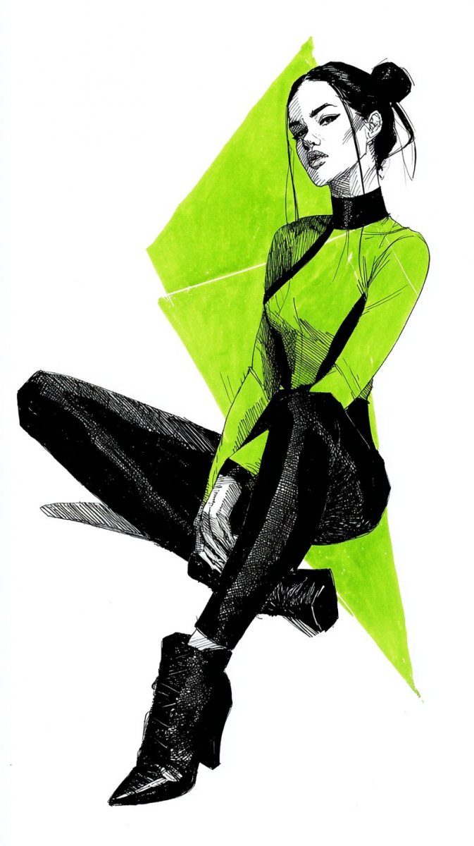 #2. illustration, ink drawing, vixen, wearing a fitted neon green bodysuit with cut-out details, black ankle boots, long dark hair styled in sleek ponytail, striking a fierce pose with one hand on hip, background features abstract geometric shapes, edgy vibe, #role_fashion_model