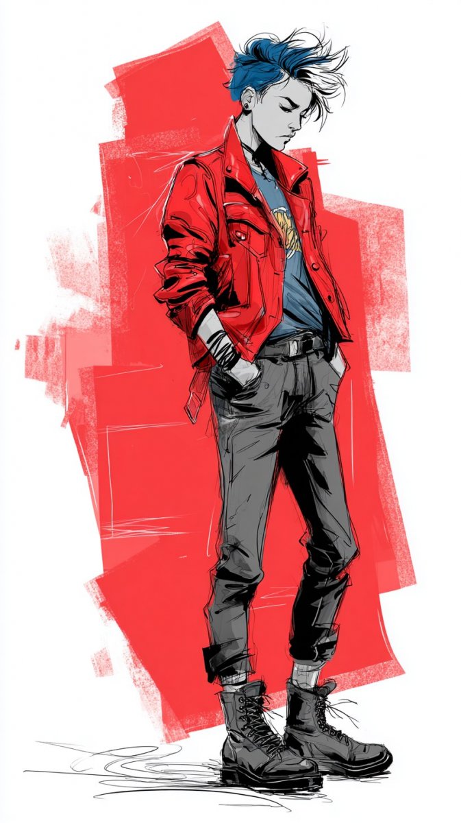 #5. illustration, ink drawing, knockout, donning a bold red leather jacket, high-waisted black jeans, black combat boots, short spiky hair dyed bright blue, exuding confidence and attitude, background appears to be an urban street scene, dynamic energy, #role_fashion_model