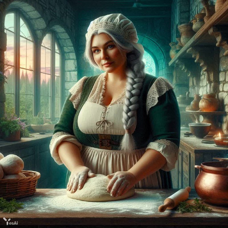 В глубине древнего сказочного поместья, где время словно застыло, разворачивается сцена уюта и магии. В центре внимания – добродушная повариха лет пятидесяти, ее загорелая кожа говорит о долгих годах труда на свежем воздухе. Длинные седые волосы аккуратно заплетены и спрятаны под белым чепцом с кружевной отделкой, добавляющим образу нотку старомодной элегантности. Кремовое нагрудное полотенце, испачканное мукой – свидетельство ее неустанного труда, контрастирует с темным зеленым платьем, скрывающимся под ним. Она усердно вымешивает тесто на большом деревянном столе, ее движения полны уверенности и опыта. Взгляд ее добрый, но в то же время исполнен усталости, словно отражает тяжесть прожитых лет и бесчисленные заботы о других. Ее глаза смотрят прямо на зрителя, устанавливая тихую, почти интимную связь. Фон картины представляет собой кухню древнего поместья: каменные стены хранят память о многих поколениях, а медные котлы и пучки сушеных трав создают атмосферу волшебства и домашнего тепла. На полках мерцают кристаллы, излучающие мягкое магическое свечение, добавляя картине сказочный оттенок. Окно открывает захватывающий вид на лес, окрашенный закатным солнцем в оттенки оранжевого и золотого. Вся сцена пронизана яркими красками: зеленый цвет стен гармонично сочетается с кремовым цветом фартука и белым кружевом чепца, а теплые акценты оранжевого цвета подчеркивают уютную атмосферу. Гиперреализм изображения позволяет почувствовать текстуру теста под руками поварихи, ощутить тепло очага и вдохнуть аромат свежей выпечки. Это портрет простого человека в волшебном мире, наполненный добротой, трудолюбием и легкой грустью. Картина передает ощущение тепла домашнего очага, защищенного от невзгод внешнего мира, где магия переплетается с повседневной жизнью