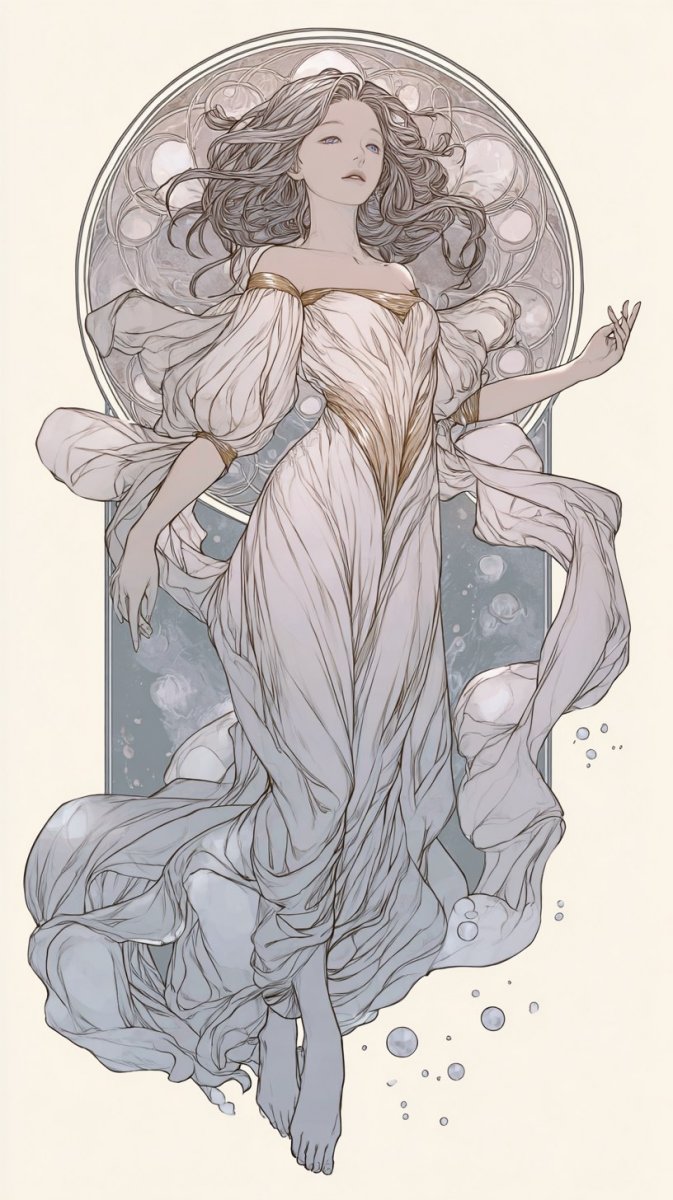 Изящное изображение богини, выполненное в технике чернильной живописи, пленяет своей неземной красотой и спокойствием. Она запечатлена в роскошном струящемся белом платье с золотыми акцентами, подчеркивающими ее возвышенный статус. Длинные волнистые волосы мягко ниспадают на плечи, создавая ощущение легкости и невесомости. Вокруг фигуры богини парят светящиеся сферы света, усиливающие мистическую атмосферу произведения. Выражение лица умиротворенное и безмятежное, передающее внутреннюю гармонию и духовную чистоту. Мягкие пастельные тона в заднем плане создают ощущение нежности и хрупкости, дополняя общую сказочную и очаровательную атмосферу картины. Эта иллюстрация воплощает собой идеал женственности, грации и божественной красоты, представляя собой визуальное олицетворение изысканного стиля и утонченного вкуса. Работа словно приглашает зрителя окунуться в мир грез и фантазий, где царят спокойствие и гармония. Это не просто изображение – это портал в другую реальность, наполненную волшебством и тайнами. Художественное исполнение демонстрирует высокий уровень мастерства и внимание к деталям, делая работу поистине уникальной и запоминающейся. Использование чернил придает изображению особую глубину и выразительность, а пастельные цвета смягчают резкость линий и создают ощущение воздушности
