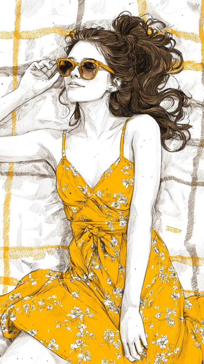 #4. illustration, ink drawing, charm, posing in cute yellow sundress with floral patterns, long brown hair styled in a loose ponytail, wearing oversized sunglasses and sitting on a picnic blanket, bright sunshine illuminating the scene, cheerful and playful atmosphere. #role_fashion_model