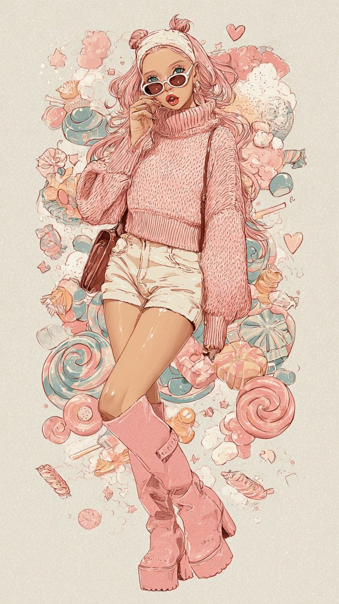 #4. illustration, ink drawing, dollface, dressed in cute pastel outfit with oversized accessories, large expressive eyes, striking a playful pose, background filled with whimsical elements like candy and hearts #role_fashion_model